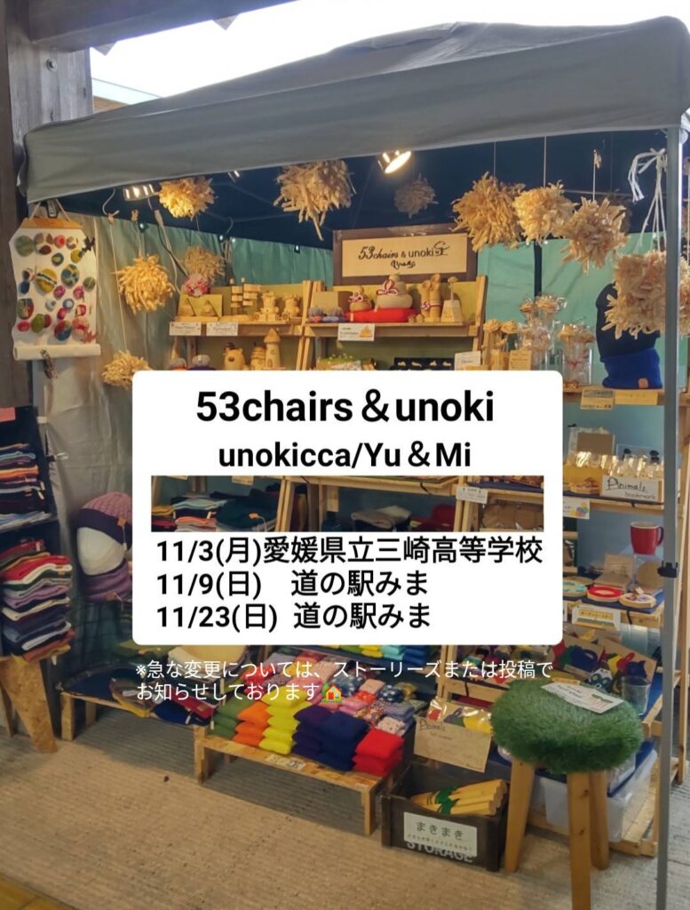 こんにちは!53chairs&unoki、unokicca、Yu&Miの近日の出店日の予定をお知らせいたします(*^-^*) 昨年から引き続き、伊方町にある愛媛県立三崎高等学校の文化祭に出店させていただくことになりました!!道の駅みまへの出店は、9日・23日を予定しています★ 心よりお待ちしております♪ 🌲11月3日(月) 愛媛県立三崎高等学校 🌲11月9日(日) 道の駅みま 🌲11月 23 日(日) 道の駅みま ※急な日程等の変更は、Instagramのストーリーズまたは投稿でお知らせしております。そちらも併せてご確認ください。