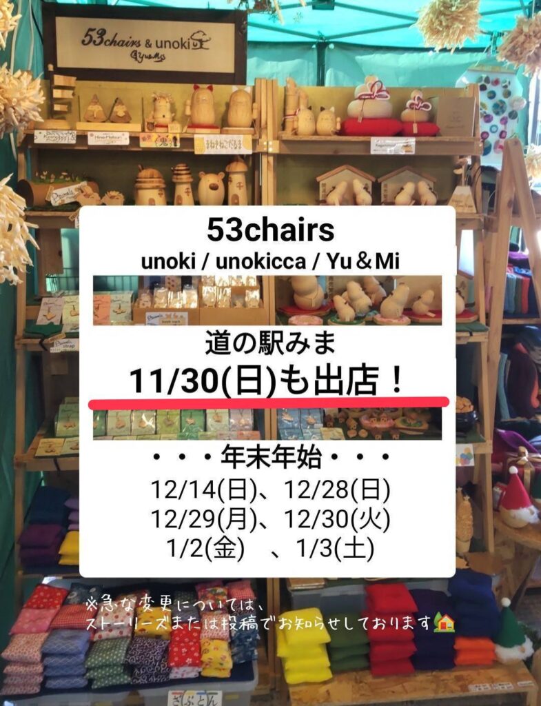 こんにちは!53chairs&unoki,unokicca,Yu&Miの近日の出店予定日をお知らせいたします。年末年始の予定が決定しましたのでお知らせします。unokiでは木製の干支飾りや鏡餅をご用意しております!Yu&Miのニット帽もおすすめです♪